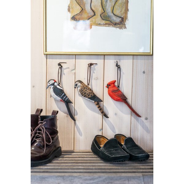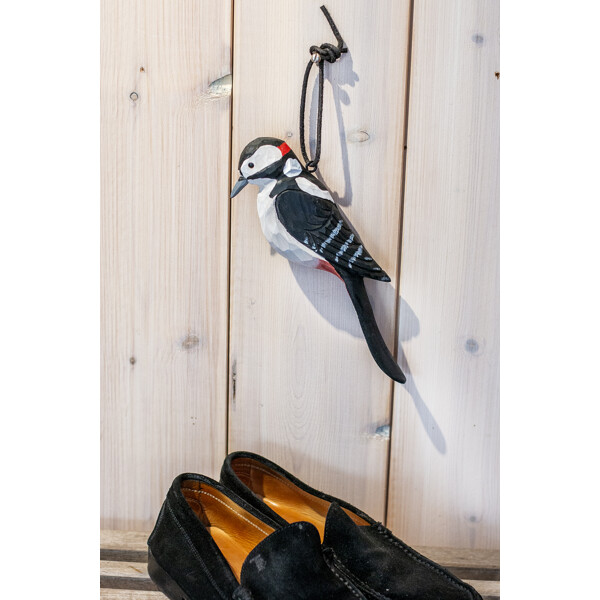 Der Schuhlöffel ist eine naturgetreue Darstellung von Vögeln, bei der die Schwanzfedern verlängert und zu einem Schuhlöffel geformt wurden. Er wird bequem an seiner Lederschlaufe aufgehängt.