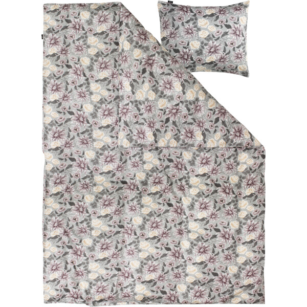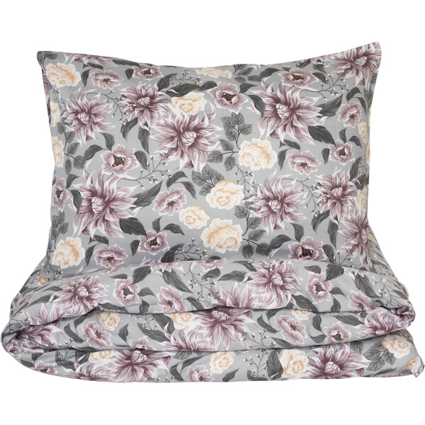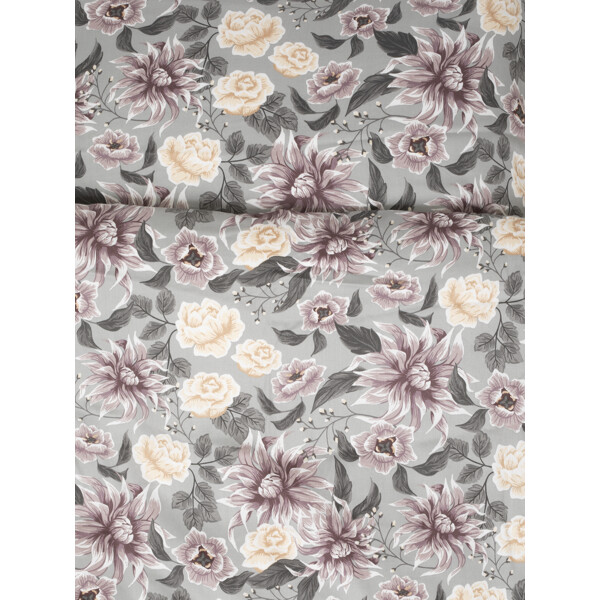 Bettwäsche-Set aus weichem Satin mit einem Motiv aus aprikosenfarbenen Blumen und großen, schönen, lila Dahlien auf grauem Hintergrund.