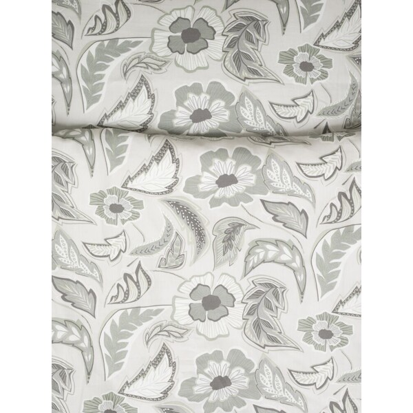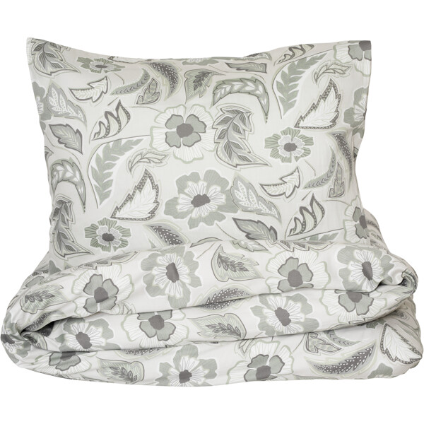 Bettwäsche-Set aus angenehmem und weichem Satin mit modernem, von Paisley inspiriertem Muster in sanften Beige- und Grautönen auf weißem Hintergrund.