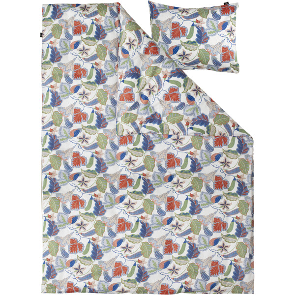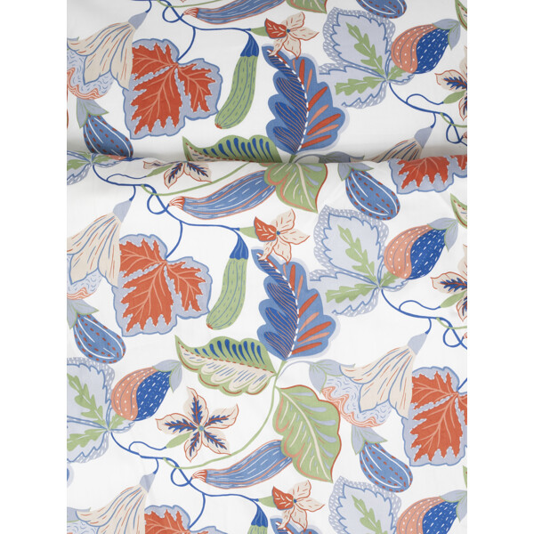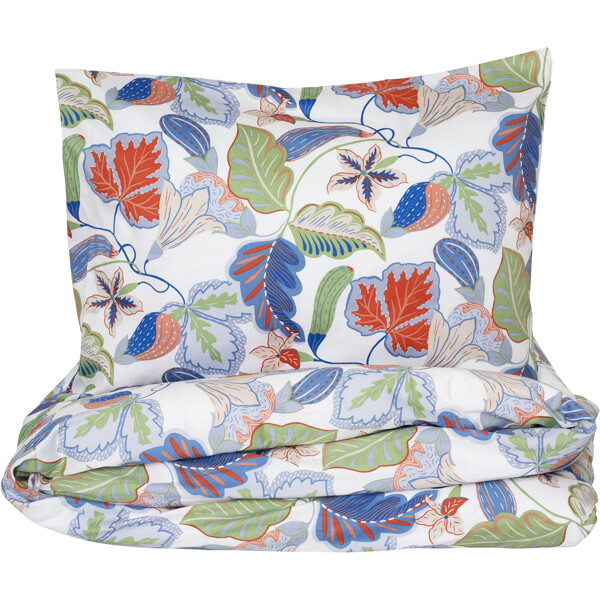 Bettwäsche-Set aus angenehmem und weichem Satin. Weißer Hintergrund mit großem Muster aus schlingenden Blumen, Blättern und Samenkapseln, die durch ihre Farbenpracht an Monets Gärten erinnern.