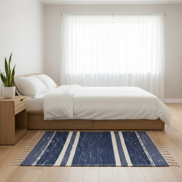 Design: Elegantes Streifenmuster.Handgefertigte Qualität: Jeder Teppich ist sorgfältig handgewebt, was einzigartige Variationen und ein echtes handwerkliches Gefühl gewährleistet, das seinen Charme erhöht.Weich & Langlebig: Hergestellt aus natürlicher Baumwolle, bietet er ein angenehmes Gefühl unter den Füßen.Vielseitige Einrichtung: Passt zu einer Vielzahl von Einrichtungsstilen, von Küsten- und Landhausstil bis hin zu zeitgenössischem und minimalistischem Stil.