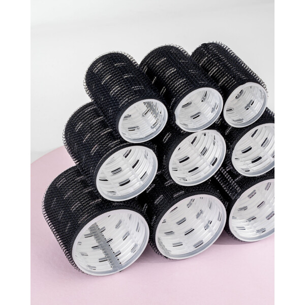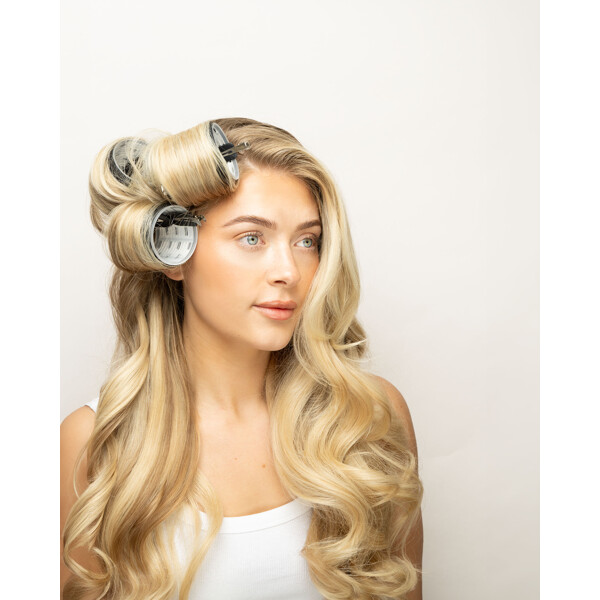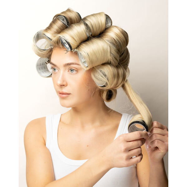 • Für beste Ergebnisse – föhnen Sie das Haar trocken, bevor Sie mit dem Stylen beginnen, oder verwenden Sie einen Lockenstab. Sie können die Lockenwickler auch schnell mit dem Föhn aufheizen.• Teilen Sie das Haar in gleichmäßige Abschnitte – verwenden Sie kleinere Abschnitte für maximales Volumen.• Wenn das Haar noch warm ist, nehmen Sie eine Haarsträhne und platzieren Sie den Lockenwickler an den Spitzen. Rollen Sie dann nach innen zur Kopfhaut hin und stellen Sie sicher, dass das Haar fest um den Lockenwickler gewickelt ist.• Verwenden Sie die großen Lockenwickler vorne und rollen Sie vom Gesicht weg, um an den Wurzeln mehr Volumen zu schaffen.• Befestigen Sie die Lockenwickler an Ort und Stelle und geben Sie ihnen eine letzte Runde Wärme mit dem Föhn.• Lassen Sie die Lockenwickler mindestens 20–30 Minuten einwirken – je länger Sie sie einwirken lassen, desto mehr Volumen und Sprungkraft erhalten Sie.• Wenn sie abgekühlt sind, rollen Sie sie vorsichtig aus.• Stylen Sie das Haar nach Wunsch und beenden Sie mit Haarspray für extra Halt.