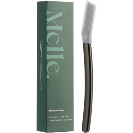 Melle. Dermaplane Razor - Gesichtsrasierer ist ein superscharfes, einseitiges Rasiermesser, das sanft selbst die feinsten Gesichtshaare entfernt, die Konturen glättet und die Augenbrauen formt.
