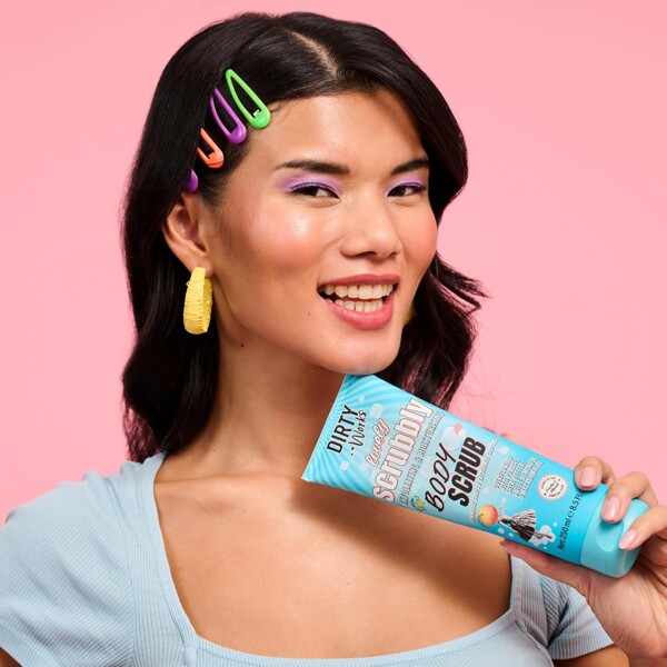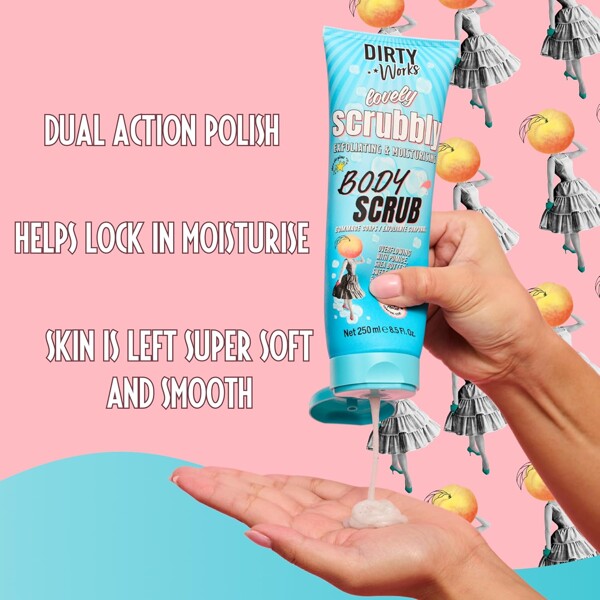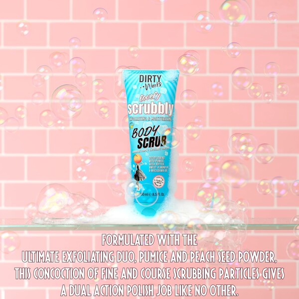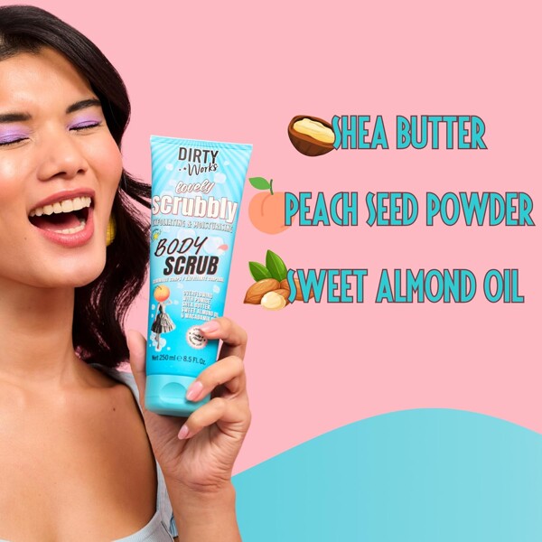Verabschieden Sie sich von trockener, langweiliger und schuppiger Haut und entdecken Sie ein weicheres, erneuertes Selbst von Kopf bis Fuß mit dem Dirty Works Lovely Scrubbly Body Scrub. Enthält exfolierenden Bimsstein und zerkleinerte Pfirsichkerne, feuchtigkeitsspendendes Sheabutteröl, pflegendes Vitamin E sowie einen exotischen Duft von ätherischen Ölen aus Sonnenblumen, Neroli und Jasmin.