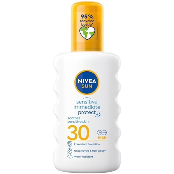 Nivea Sun Sensitive Immediate Protect SPF30 ist ein Sonnenspray für den Körper mit einem hohen Sonnenschutz, das der Haut sofortigen Schutz bietet und vor UVA- und UVB-Strahlen, sonnenbedingten Hautirritationen sowie vorzeitiger Hautalterung schützt. Es enthält Aloe Vera und Jojobaöl, ist wasserfest, parfümfrei und beruhigt empfindliche Haut.