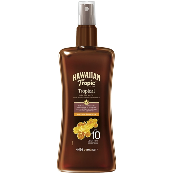 Hawaiian Tropic Protective Dry Spray Oil Spf 10 hat eine Formel, die trockenes Öl enthält. Trockene Öle dringen schnell in die Haut ein und hinterlassen keine ölige Oberfläche wie herkömmliche Öle. Es bietet UVA-, UVB- und IR-Schutz. Es ist wasserfest bis zu 80 Minuten und schützt die Haut vor Austrocknung.Hypoallergen.Dermatologisch getestet.Feuchtigkeitsspendend.