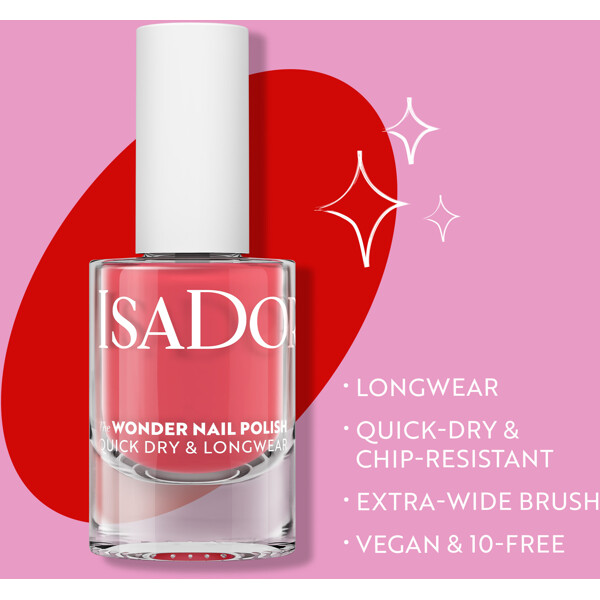 IsaDora Wonder Nail ist ein besonders langlebiger und schnell trocknender Nagellack mit einem extra breiten Pinsel, der den Nagel in einem Zug bedeckt. Der Lack ist farbbeständig und behält seinen Glanz besonders lange. Jede Borstensträhne ist geschliffen, um Streifen nach dem Auftragen zu vermeiden.
