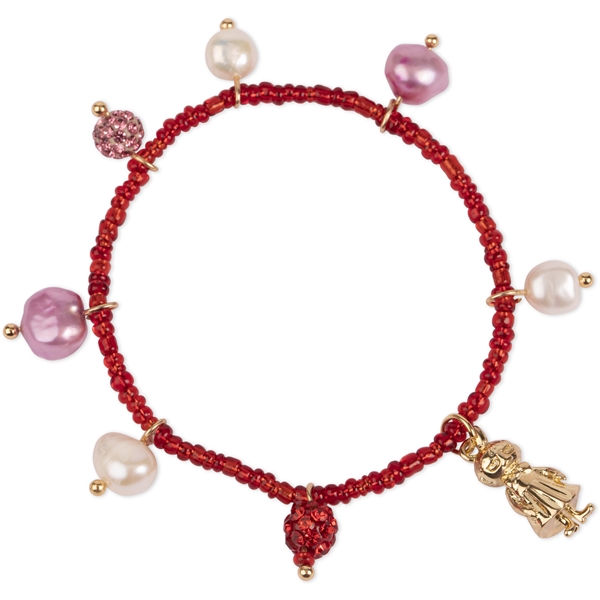Ein handgefertigtes elastisches Kinderarmband mit roten Glasperlen, zwei rosa hängenden Glitzerkugeln und echten Süßwasserperlen. In der Mitte hängt ein vergoldeter Lilla My-Anhänger, der 17 mm hoch ist.