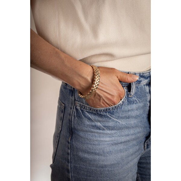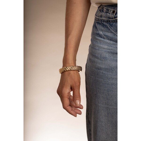 Ein elastisches Armband aus Metall mit Goldplattierung. Das Armband hat ein schönes Muster, das luxuriös und modern wirkt.
