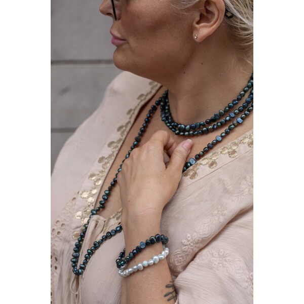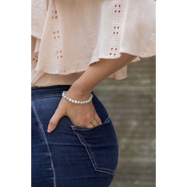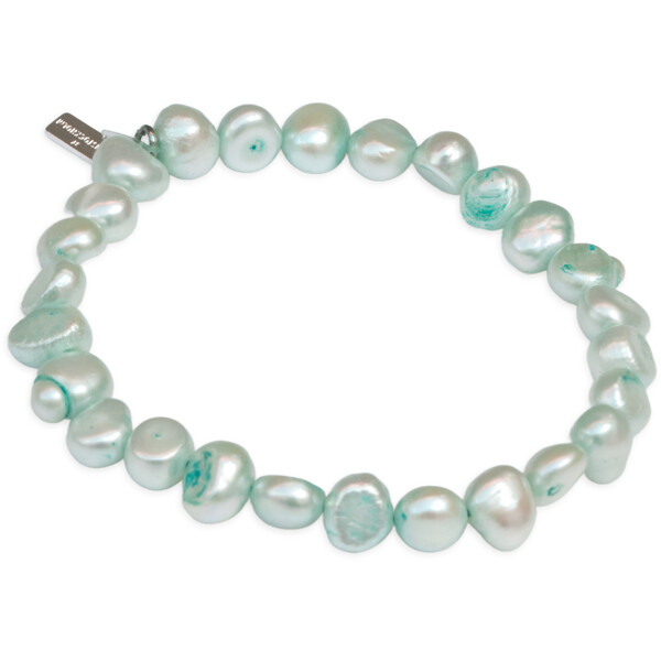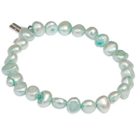 Ein helltürkisfarbenes elastisches Perlenarmband mit echten Süßwasserperlen. Da die Perlen in Türkis eingefärbt sind, gibt es einige Flecken auf den Perlen mit extra Türkis, wo die Perlen eine unebene Oberfläche haben.