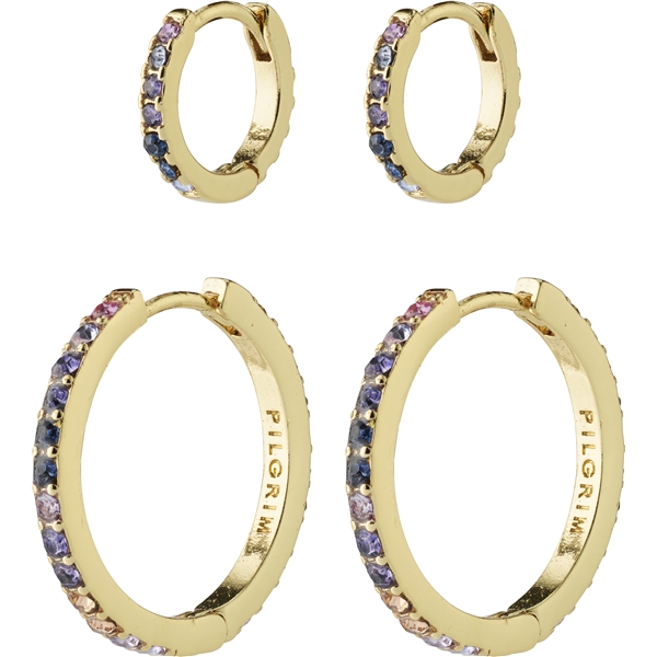 Vergoldete Kristall-Creolen von Pilgrim. Das klassische Creolen-Design der Ohrringe hat einen glamourösen Twist mit vielen Preciosa-Kristallen in Blau- und Champagnertönen erhalten, was einen einzigartigen Kontrast zum minimalistischen Look schafft. Das dünne, kantige Design der Ohrringe in Small und Medium Size ist ein Set Evergreens, das garantiert dein Outfit sowohl für Basic- als auch Glam-Anlässe vervollständigen wird.