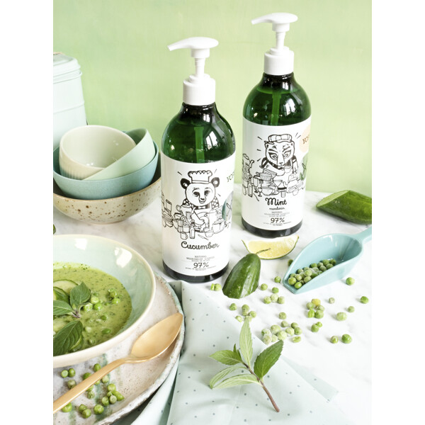 5-15% anionic surfactants, <5% non-ionic surfactants, <5% amphoteric surfactants, preservative (Methylisothiazolinone, Benzisothiazolinone), parfum. Other ingredients: cucumber extract, aloe extract. Suitable for vegan, no animal ingredients.