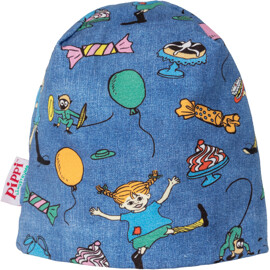 Eine weiche und bequeme Pippi Langstrumpf-Mütze für Kinder. Die Mütze ist aus doppellagigem Jersey gefertigt, in einem herrlichen Denimblau mit festlichem Muster. Das Produkt enthält zertifizierte Bio-Baumwolle.
