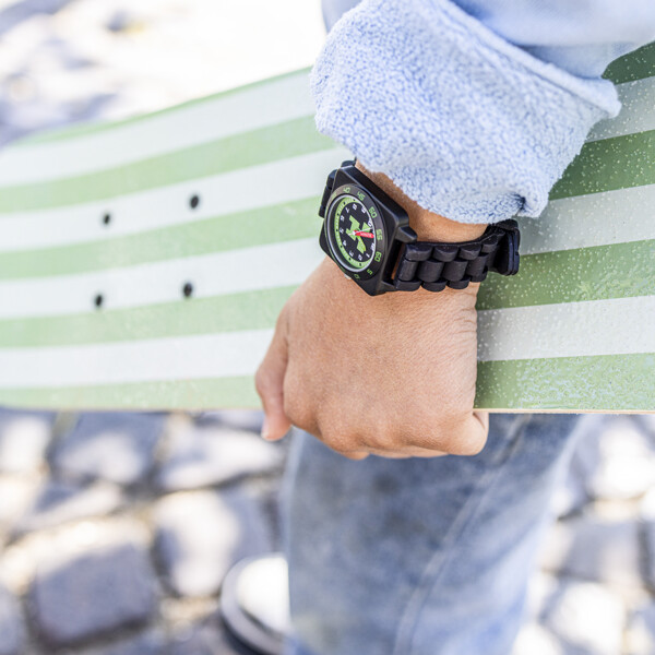 Die Uhr hat ein Zifferblatt mit Plexiglas und ein weiches Armband aus Silikon. Die Uhr besteht aus rostfreiem Stahl und ist wasserabweisend.