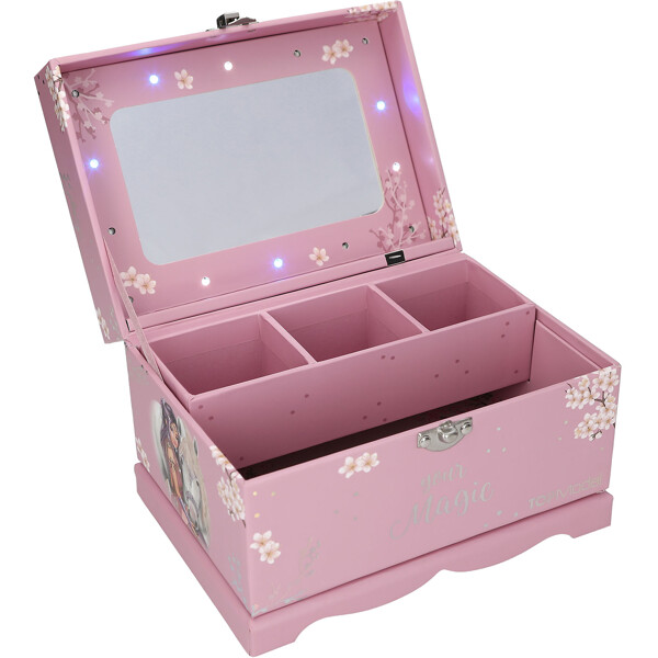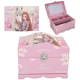 Das Schmuckkästchen ist in hellem Lila gehalten und zeigt ein bezauberndes TOPModel-Motiv zusammen mit einem schönen Pferd auf dem Deckel. Es bietet viel Platz für Schmuck im großen Hauptfach und in der tiefen, herausnehmbaren Schale mit drei Fächern. Mit einem coolen, magischen Effekt: Beim Öffnen des Deckels leuchten und funkeln 14 LED-Lampen in verschiedenen Farben rund um den großen Innenspiegel.