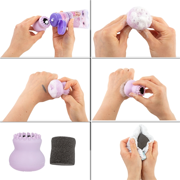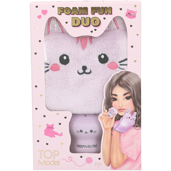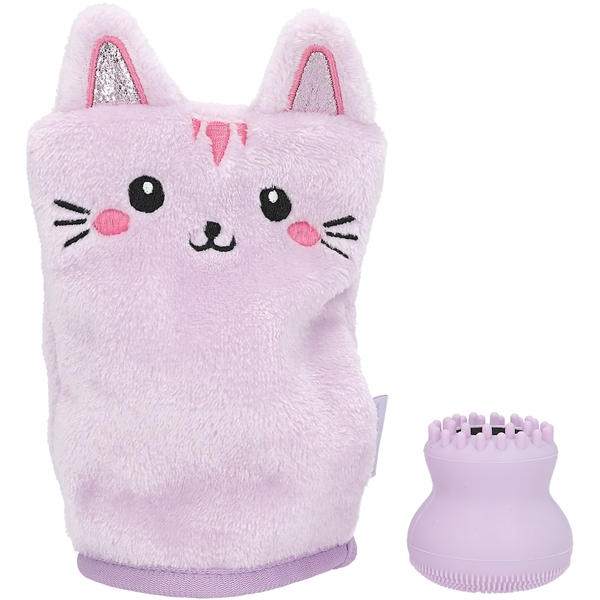 Das schäumende Duo von TOPModel BEAUTY and ME besteht aus einer Gesichtsreinigungsbürste mit einem süßen Katzengesicht und einem herrlich weichen Waschhandschuh mit glitzernden Katzenohren und einem gestickten Katzengesicht. Beide in einem weichen hellen Lila. Die Gesichtsreinigungsbürste kann mit Seife gefüllt werden, die durch Drücken aufgeschäumt wird.
