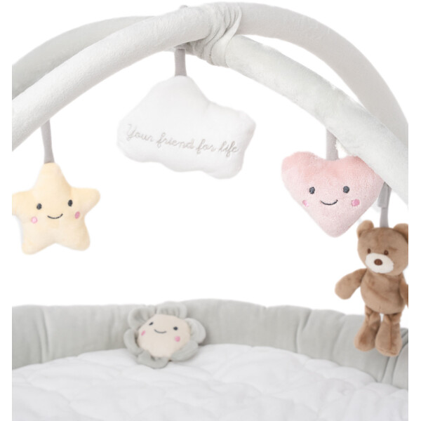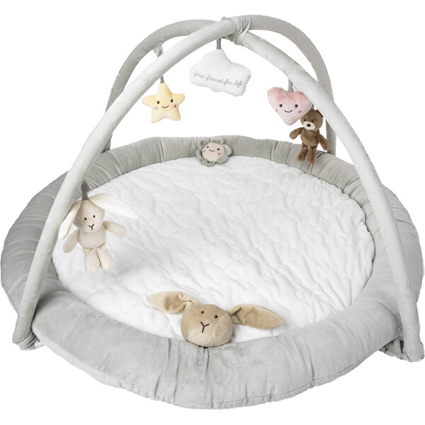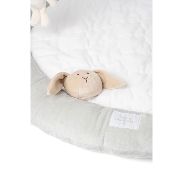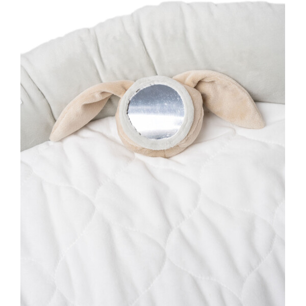Eine dicke, gepolsterte Spielmatte, die weich zum Liegen ist und das Kind vor Kälte auf dem Boden schützt. Blume mit taktilem Knisterpapier. Spiegel auf der Rückseite des Kaninchenkopfes, damit das Kind sich selbst sehen kann. Abnehmbare Anhänger, mit denen man auch spielen kann, wenn die Bögen entfernt werden.