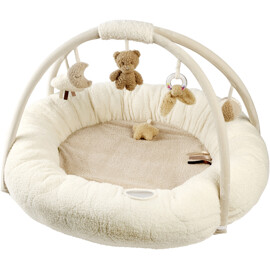 Nattou Spielmatte mit Bogen ist ein weicher, plüschiger Spielplatz, auf dem sich Ihr Kind sicher und wohl fühlt. Der dick gepolsterte Rand und der Spielbogen mit Plüschspielzeugen, Rasseln, Spiegeln und anderem Zubehör laden Ihr Kind ein, zu greifen, zu erkunden und zu spielen. Greifreflexe und sensorische Fähigkeiten werden durch das Spielen stimuliert, während sich Ihr Kind auch auf der weichen Matte entspannen kann. Die Bögen sind abnehmbar, sodass die Matte auch allein verwendet werden kann.ProduktspezifikationenBabyspielmatte: 90 × 90 × 48 cm (L x B x H)Material: 100 % PolyesterEnthält gepolsterten Rand, abnehmbare Bögen mit Plüschspielzeugen, Rasseln, Spiegeln und ZubehörPflege: Matte kann bei 30 °C in der Maschine gewaschen werden, Bögen abnehmbar mit Schnalle (nicht im Trockner trocknen)