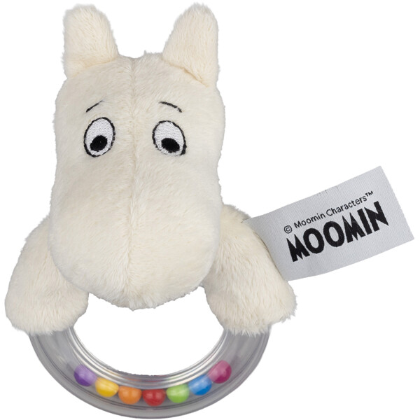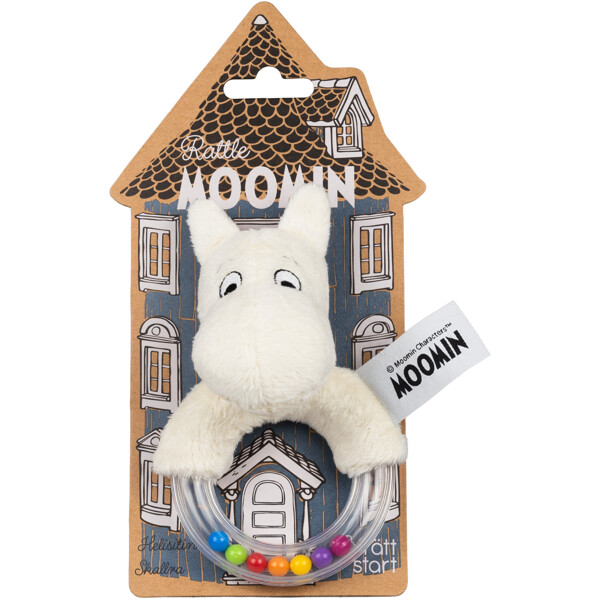 Verspielte Rassel mit Mumin. Perfekt, um die Feinmotorik und sensorischen Fähigkeiten zu fördern. Leicht zu greifen und hat ein rasselndes Geräusch, das das Hörvermögen des Kindes stimuliert.