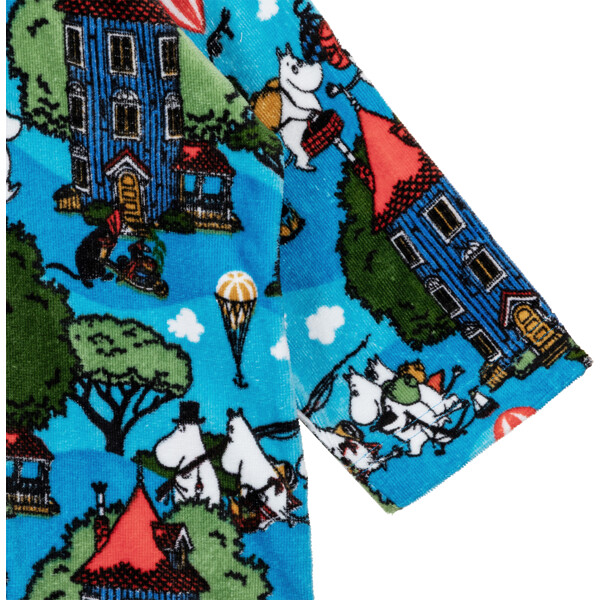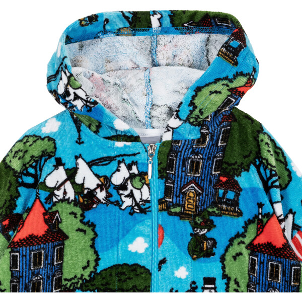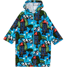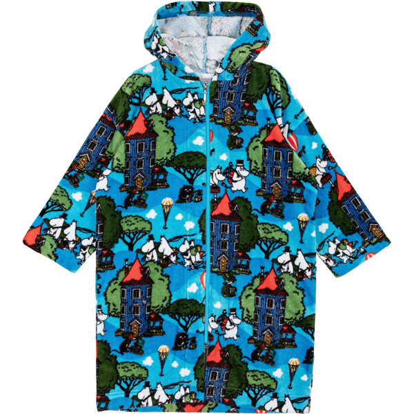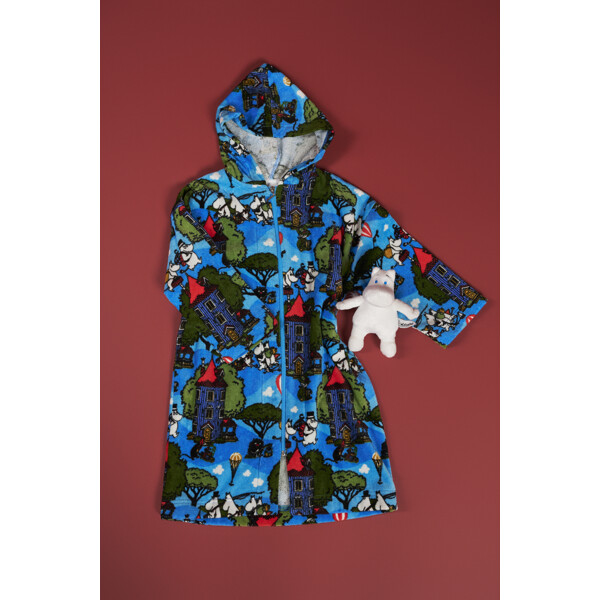 Ein weicher und gemütlicher Mumin-Bademantel für Kinder. Der Bademantel hat eine Kapuze, eine Aufhängeschlaufe im Nacken und einen Reißverschluss vorne. Das Material ist weicher Baumwollsamt mit einer Innenseite aus Frottee mit hoher Saugfähigkeit.