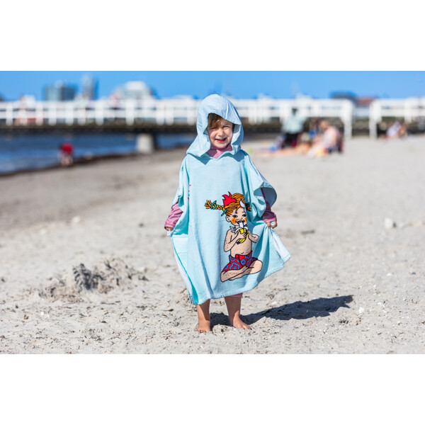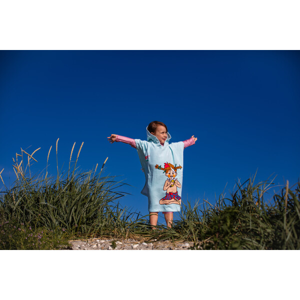 Badeponcho Pippi Söderhavet ist ein cleverer Poncho mit Schnürung an der Seite. Das Motiv auf der Vorderseite zeigt Pippi in Badekleidung, die eine Banane isst. Der Poncho ist perfekt, um ihn für die Kleinen mit an den Strand zu nehmen, um sie zwischen den Badegängen zu wärmen.