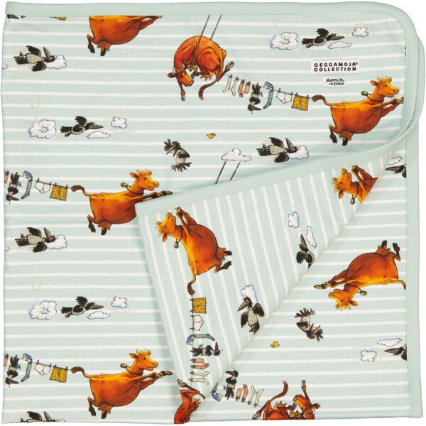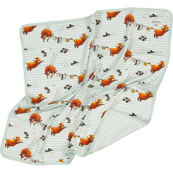 Eine herrlich weiche Babydecke mit vielen Verwendungsmöglichkeiten. Motiv mit der klugen Kuh Mama Muh. Das Schmusetuch ist aus weichem und angenehmem Bio-Baumwolljersey gefertigt.
