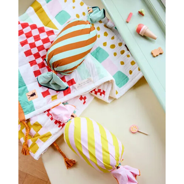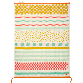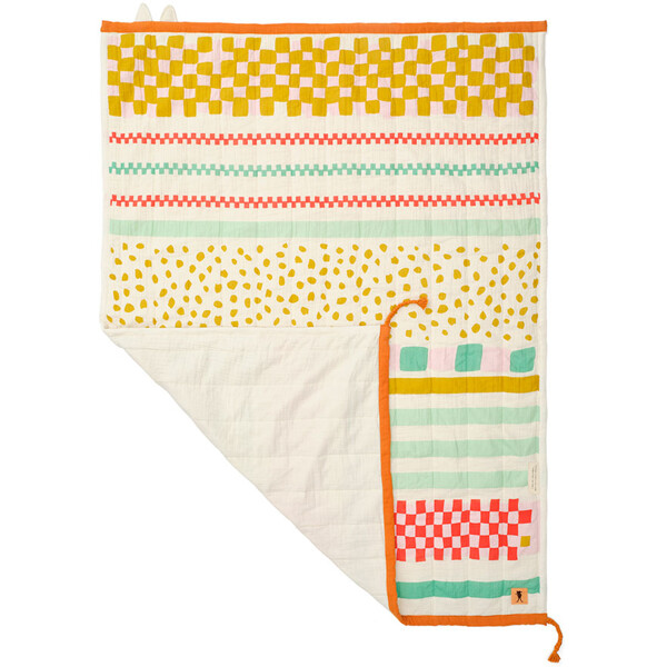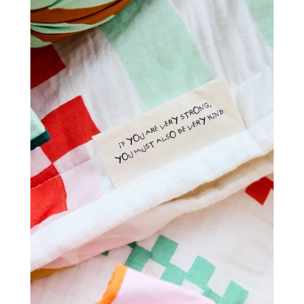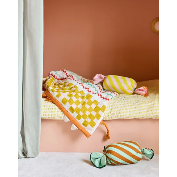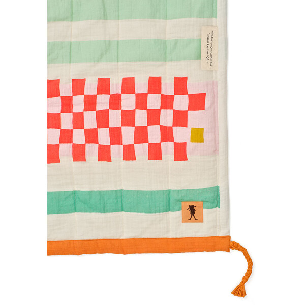 Die Decke ist aus Schicht-auf-Schicht gewebtem Baumwoll-Musselin genäht – ein leichtes und luftiges Gewebe – mit einer dünnen Füllung aus recyceltem Polyester. Sie bietet genau die richtige Wärme beim Ausruhen, Schlafengehen oder wenn das Kind sich auf dem Sofa einkuscheln möchte. Der Druck auf der Vorderseite basiert auf Illustrationen aus den Pippi Langstrumpf-Büchern. Auf der Rückseite befindet sich ein aufgenähtes Stoffetikett mit dem Zitat – als kleine Botschaft von Pippi selbst. An einem Ende sind zwei Stoffzöpfe und zwei Stoffohren angebracht – ein Augenzwinkern zu Pippi und ihrem Pferd.