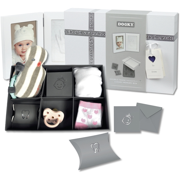 Ein schönes Set, das sich beispielsweise als Taufgeschenk eignet. Mit Doppelrahmen und Ton für Fuß- und Handabdrücke + Erinnerungsboxen für Schnuller, Haarlocke, Zahn usw. (insgesamt 6 Boxen).