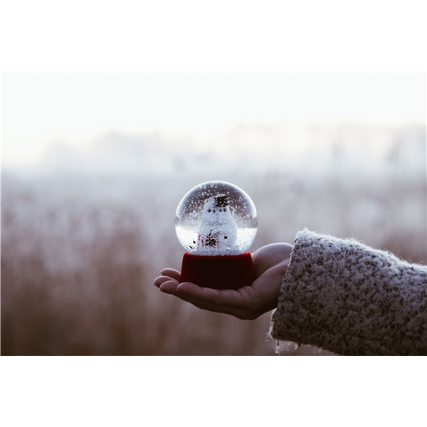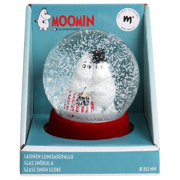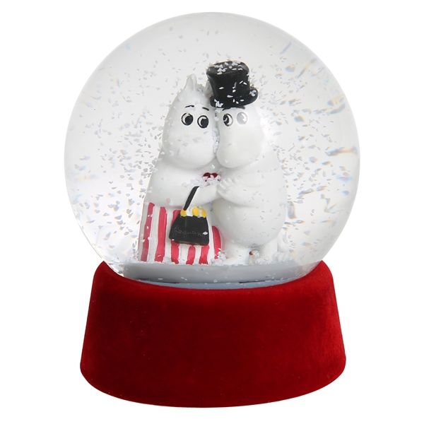 Dekorative Schneekugel aus Glas mit Muminmama und Muminpapa. Wenn man die Kugel umdreht und wieder zurückstellt, fallen die Schneeflocken auf das umarmende Paar herab. Die Höhe der Schneekugel beträgt 10 cm.