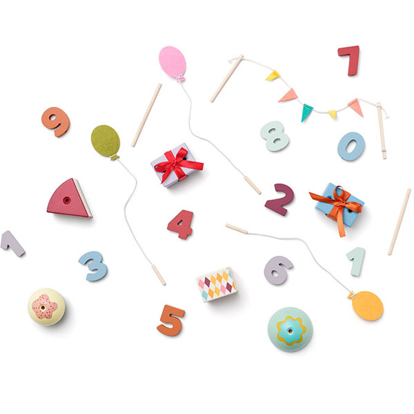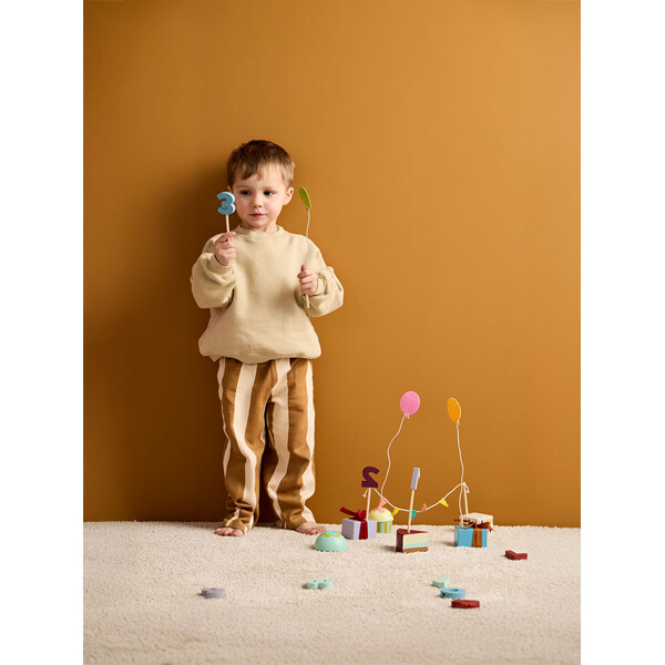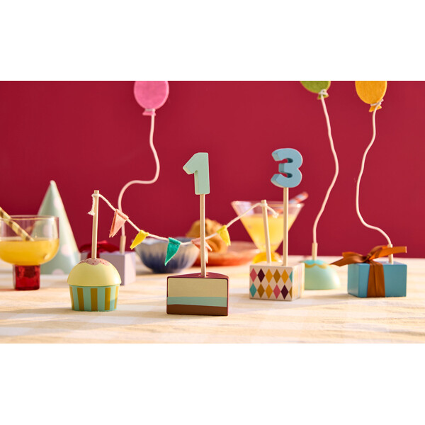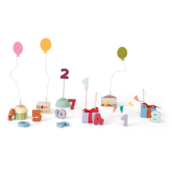 Jede Figur hat eine Nummer, um das Alter des Geburtstagskindes zu markieren. Das Set kommt mit den Zahlen 0 bis 9 sowie einer zusätzlichen Zahl 1, was es ermöglicht, es bei mehreren Geburtstagen zu verwenden. Zwei Filzballons an Metalldrähten bieten ein zusätzliches dekoratives Detail. Eine Pappschachtel ist ebenfalls enthalten, in der alle Teile aufbewahrt werden können und Jahr für Jahr hervorgeholt werden können.