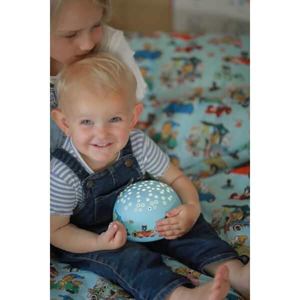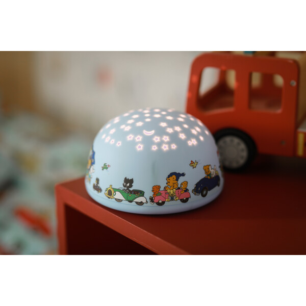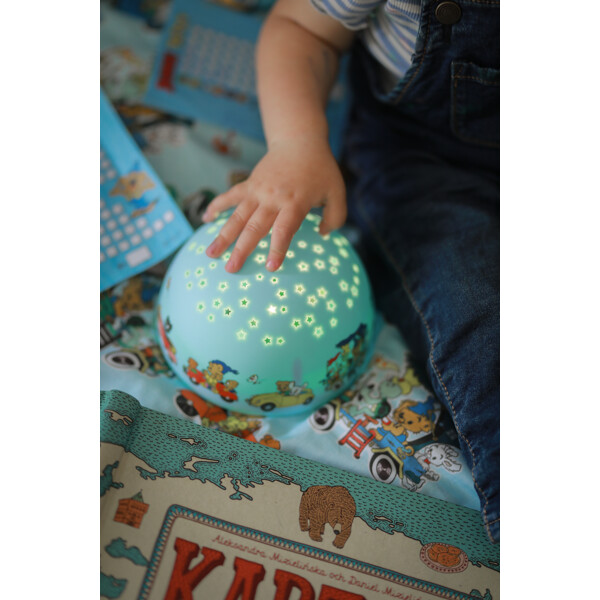 Die Bamse Nachtlampe mit Sternenprojektor erzeugt einen schönen Sternenhimmel aus warmweißen, grünen oder blauen Sternen im Kinderzimmer am Abend und in der Nacht. Sie können auch wählen, ob sie gleichzeitig eine Melodie spielen soll, während Ihr Kind einschläft (Nu i ro slumra in in zwei verschiedenen Arrangements, Lillan ska sova und Blinka lilla stjärna där). Sie lässt sich leicht mit einem Knopfdruck ein- oder ausschalten und hat einen Timer von 30 Minuten.