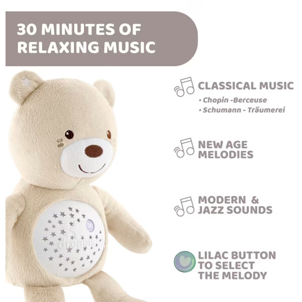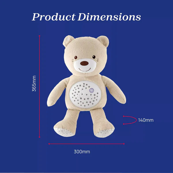 First Dreams Baby Bear ist ein weiches und freundliches Kuscheltier von Chicco zum Umarmen, das auch als Projektor mit spektakulären Lichteffekten und entspannenden Melodien für Ihr Baby dient.
