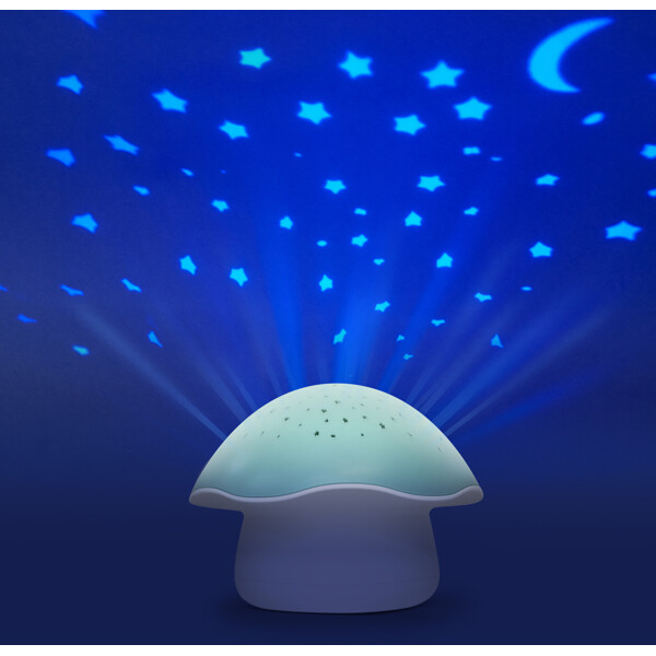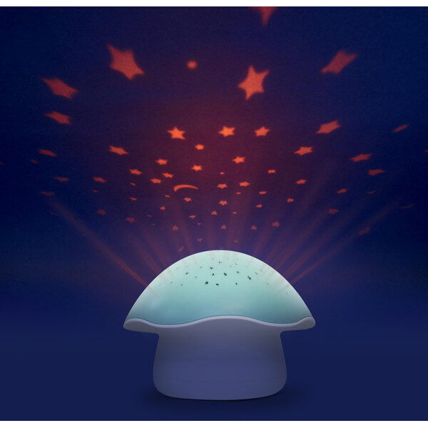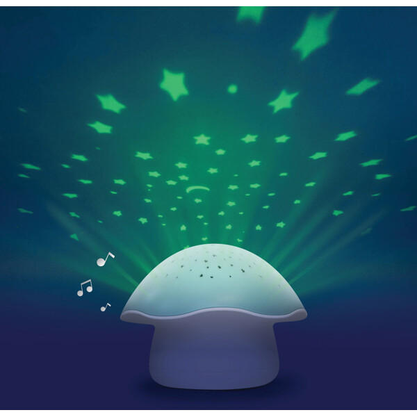 Pabobo Sternenprojektor Pilz Musik ist eine kabellose, batteriebetriebene Nachtlampe und Spieluhr, die leicht überall im Kinderzimmer platziert werden kann. Die LED-Lampe projiziert einen Sternenhimmel, der langsam die Farbe wechselt, es ist jedoch auch möglich, ein festes Licht in der Lieblingsfarbe (blau, grün oder orange) einzustellen. Die Nachtlampe kann auch ein beruhigendes Wiegenlied (2 Lautstärken) oder weißes Rauschen in Form von Herzschlägen abspielen, um dem Kind das Einschlafen zu erleichtern.Die Lampe wird mit einem einfachen Druck ein- und ausgeschaltet und schaltet sich nach 22 Minuten automatisch ab. Der intelligente, alternative Weinsensor schaltet die Lampe ein, wenn das Kind nachts aufwacht und weint. Die Lampe ist kabellos und wird mit 3 AA-Batterien betrieben.Fakten Pabobo Sternenprojektor Pilz Musik:– Projiziert Sternenhimmel in 3 Farben.– LED-Lampe, wird nicht heiß.– Spielt beruhigende Musik, zwei Lautstärken oder weißes Rauschen (Herzschläge).– Weinsensor.Alter: ab 0 Monaten.Material: 100% ABS-Kunststoff.Maße: 16 x 16 x 12 cm.Batterie: 3 x AA, nicht enthalten.Garantie: 2 Jahre.