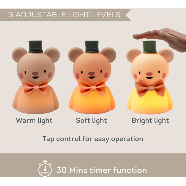 Nachtlampe aus BPA-freiem Silikon mit drei verschiedenen Lichtstufen und einem eingebauten 30-Minuten-Timer. Die Lampe ist wiederaufladbar, was sie langlebig und kosteneffektiv macht.Die Lampe erzeugt ein gemütliches und beruhigendes Licht im Kinderzimmer, und die Helligkeitsstufen lassen sich einfach per Knopfdruck ändern. Sie wird mit einem USB-Kabel aufgeladen (2 Stunden Schnellladung bieten 6 Stunden Licht), das im Lieferumfang enthalten ist.