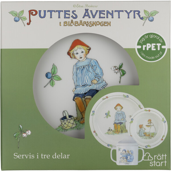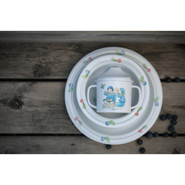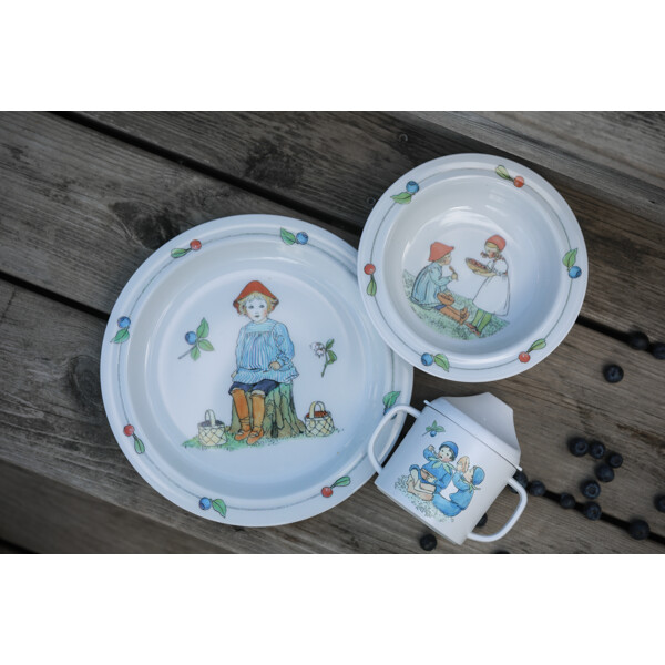 Kindergeschirrset aus drei Teilen, hergestellt aus kratzfestem Melamin mit Motiven aus den Märchen von Elsa Beskow.