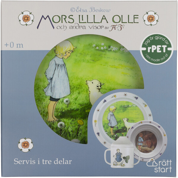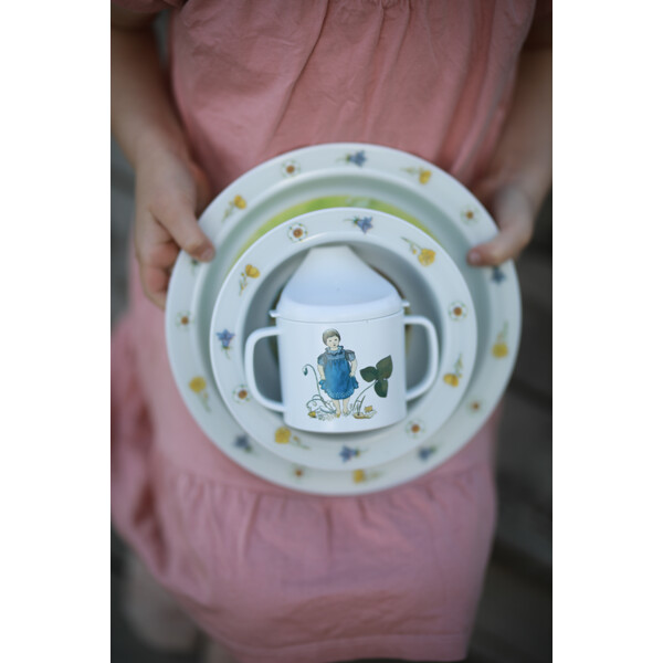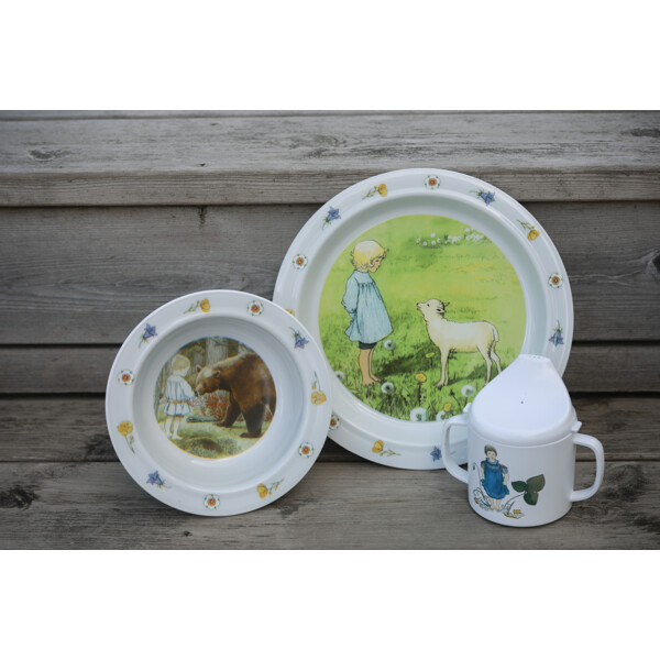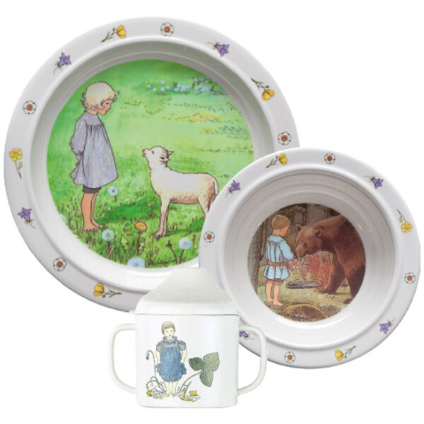 Kindergeschirrset aus drei Teilen, hergestellt aus kratzfestem Melamin mit Motiven aus den Märchen von Elsa Beskow.