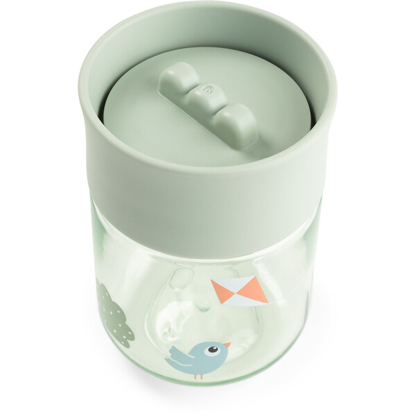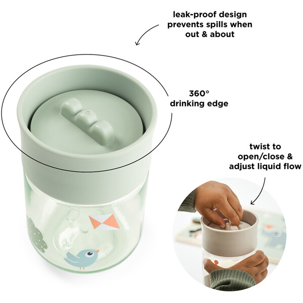 Ein intelligenter Becher mit einem 360°-Trinkrand, der es ermöglicht, von allen Seiten zu nippen, um natürliche Trinkfähigkeiten zu unterstützen. Der Deckel ist drehbar und passt den Flüssigkeitsfluss an das Trinkstadium des Kindes an. Der Becher hat ein auslaufsicheres Design, das Verschütten verhindert, wenn Sie unterwegs sind. Der Rand des Bechers ist geneigt, was ein sanftes und sicheres Nippen ermöglicht.