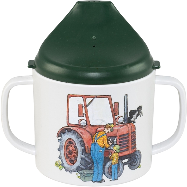Trinklernbecher mit zwei Griffen. Der Deckel sitzt dank eines Silikonrings fest und im Trinkaufsatz befindet sich ein Auslaufschutz, der den Fluss begrenzt. Wenn das Kind älter wird, kann das Ventil entfernt werden.