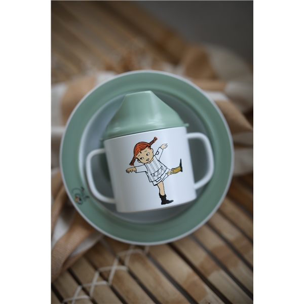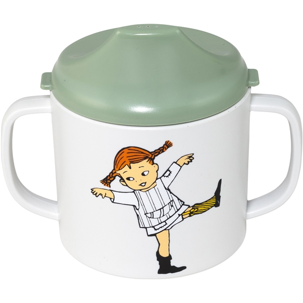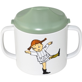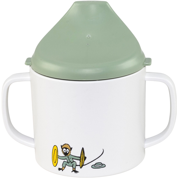 Süßer Trinklernbecher mit zwei Griffen. Der Deckel sitzt dank eines Silikonrings fest und im Trinkaufsatz befindet sich ein Auslaufschutz, der den Fluss begrenzt. Wenn das Kind älter wird, kann das Ventil entfernt werden.