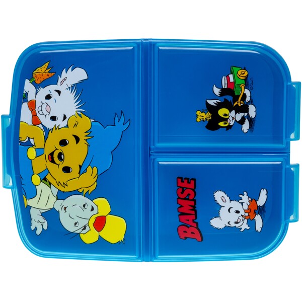 Bamse Brotdose mit 3 Fächern, wobei jedes Fach einen eigenen Deckel hat, der sich einfach mit einem Klickverschluss öffnen und schließen lässt. Perfekt, um Essen, Salat, Obst oder andere Snacks einzupacken, die das Kind mitnehmen möchte.
