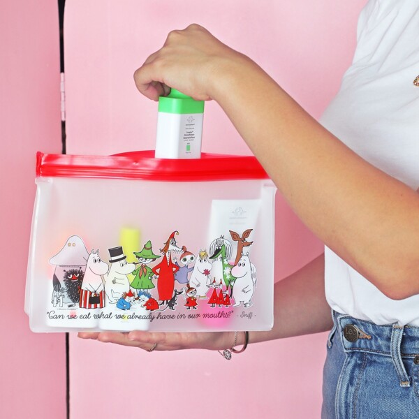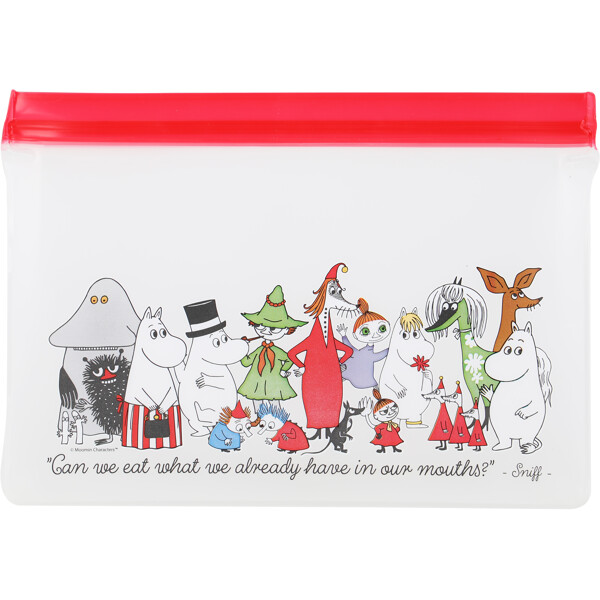 Ein Aufbewahrungsbeutel aus BPA-freiem, lebensmittelechtem PEVA-Kunststoff. Der Beutel ist farbenfroh mit der fröhlichen Muminschar über dem Text 'Können wir das essen, was wir bereits im Mund haben?' -Sniff- dekoriert.