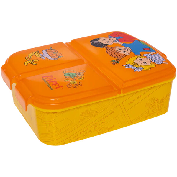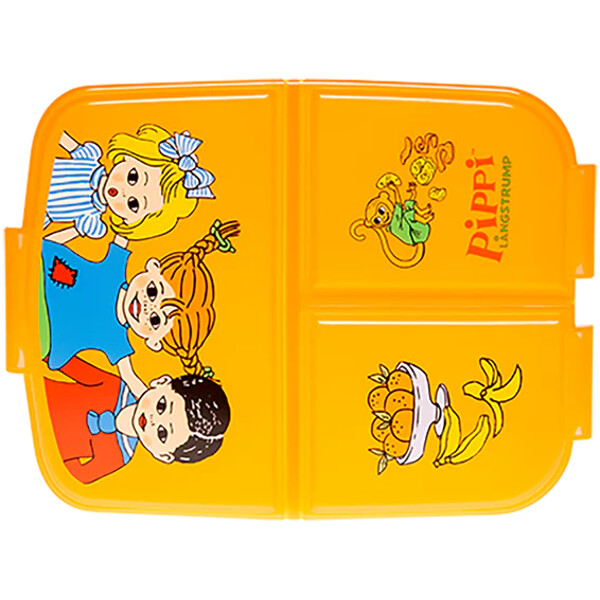 Eine schöne Brotdose mit Pippi und ihren Freunden. Die Brotdose ist aus Kunststoff gefertigt und hat drei verschiedene Fächer, die sich einfach mit seitlichen Verschlüssen schließen lassen. Perfekt, um Essen und Leckereien für die Autofahrt oder die Schule zu packen. Frei von BPA.