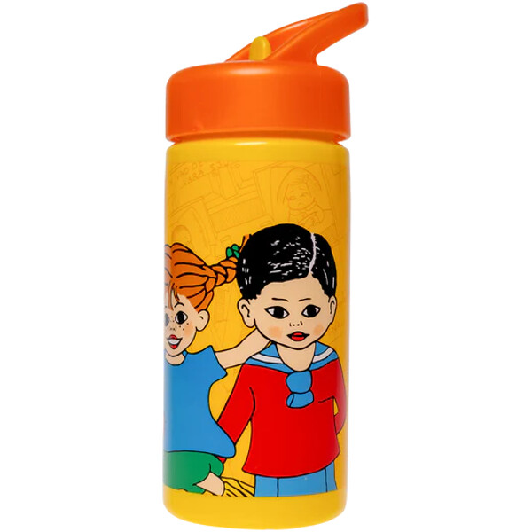 Pippi Wasserflasche ist eine praktische Wasserflasche, die das Kind tagsüber mitnehmen kann, um den Durst zu löschen. Die Wasserflasche ist gelb mit einem Aufdruck von Pippi und ihren Freunden. Im Deckel befindet sich ein Trinkhalm, der geöffnet und geschlossen werden kann, mit einem praktischen Griff, an dem das Kind die Flasche tragen kann.