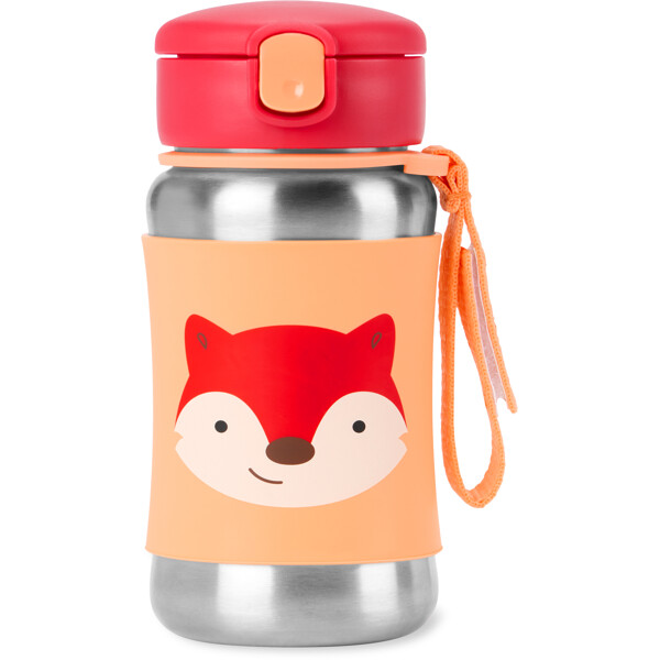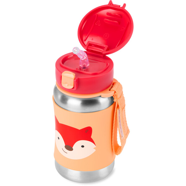 Die Zoo Sportflasche aus robustem Edelstahl verfügt über einen griffigen Silikonschutz, der die Hände des Kindes nicht abkühlt. Die Flasche hat einen integrierten Trinkhalm, einen praktischen Trageriemen und einen Pop-up-Deckel für hygienische Verwendung.
