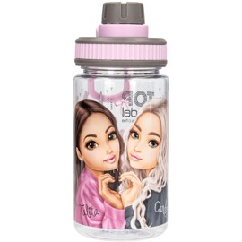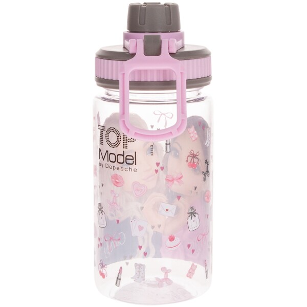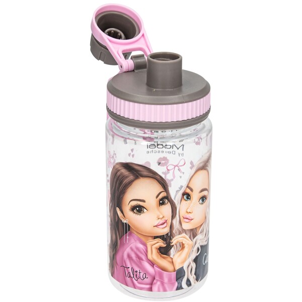Transparente Trinkflasche mit 500 ml in Rosa und Grau aus der bezaubernden TOPModel-Serie MY BFF mit einem hübschen Modellmotiv und vielen süßen Icons wie Schleifen und Herzen rundherum. Mit praktischem Griff und Schraubverschluss. Die Flasche ist aus transparentem Tritan-Kunststoff gefertigt und frei von BPA, Bisphenol und Phthalaten und zudem robust.