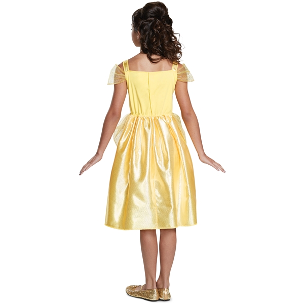 Lassen Sie Ihr Kind sich als die kluge, mutige und schöne Belle verkleiden! Dieses Kostüm hat ein gemustertes Oberteil, drapierte Ärmel mit Glitzerdetails und einen Rock mit einem drapierten Taillengürtel in Gold.
