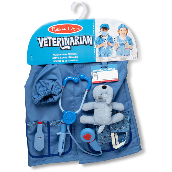 Mit diesem Tierarzt-Rollenspiel-Kostümset können Kinder fantasievoll spielen, während sie sich um ihre Spielzeug"haustiere" kümmern.Das Set enthält eine maschinenwaschbare blaue Jacke, eine Maske und eine Chirurgenmütze sowie wichtige Zubehörteile wie ein Stethoskop mit Soundeffekten, eine Spritze, ein Thermometer, einen Verband und ein wiederverwendbares Namensschild für Tierärzte. Ein weicher Patientenwelpe ist ebenfalls enthalten, den die Kinder "behandeln" und lieben können.