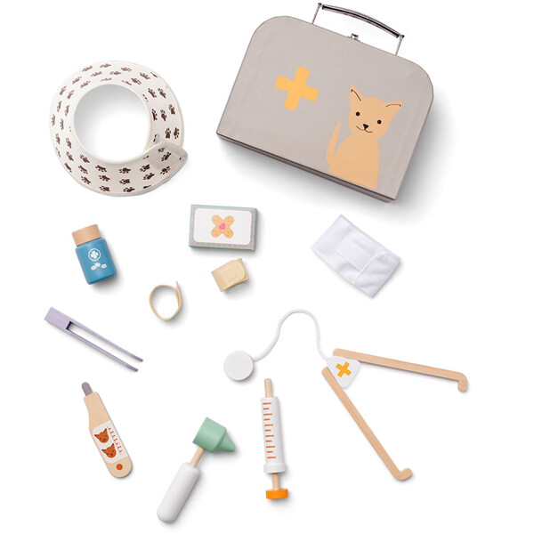 Dieses Tierarzt-Set ist perfekt für Kinder, die gerne ihre Stofftiere pflegen. Das Set enthält eine Spritze, eine Medizinflasche, fischförmiges "Katzenfutter", ein Stethoskop, ein Thermometer, eine Pinzette und einen Stoffkragen, um die Tiere daran zu hindern, nach einer Operation ihre Wunden zu lecken. Es beinhaltet auch ein Ohreninspektionswerkzeug, ein Otoskop, um die Gesundheit der Tiere zu überprüfen.