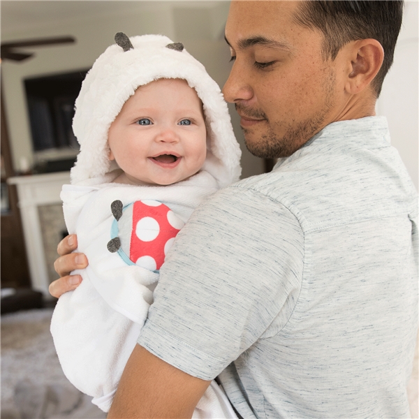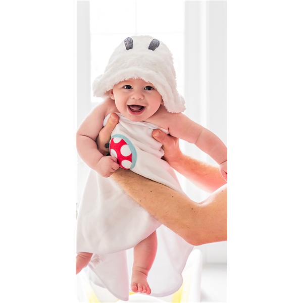 Blooming Bath Ladybug Badetuch ist ein wunderschönes Badetuch mit einem Marienkäfer-Detail. Es ist weich und angenehm aus superabsorbierendem Material. Handtuch und Kapuze sind aus 100% Baumwolle, die Innenseite der Kapuze ist aus 100% Polyester.
