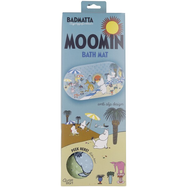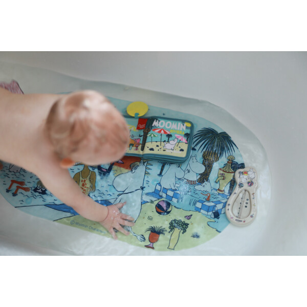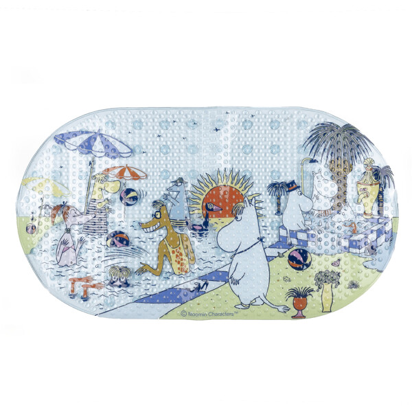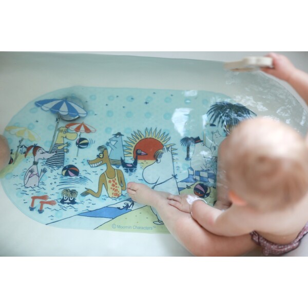 Bunter Badteppich mit Mumin-Motiv, der das Baden spaßig und rutschfest macht.Die Matte wird einfach auf den Boden der Badewanne gelegt und bleibt dank vieler Saugnäpfe an Ort und Stelle.